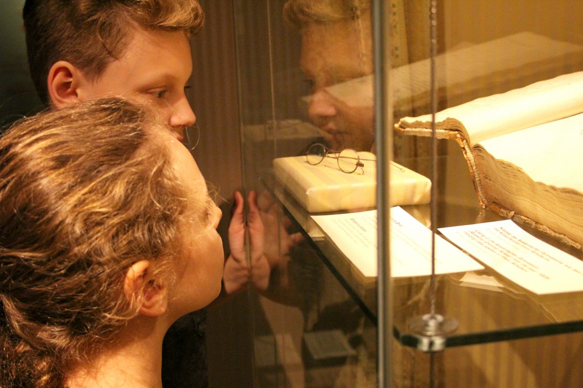 Schubert trug schon als Kind eine Brille. Wir haben in unserer Glasvitrine eine seiner Brillen. Kannst du sie finden? Diese sieht zwar aus wie eine Kinderbrille, hat aber dem erwachsenen Schubert gehört.