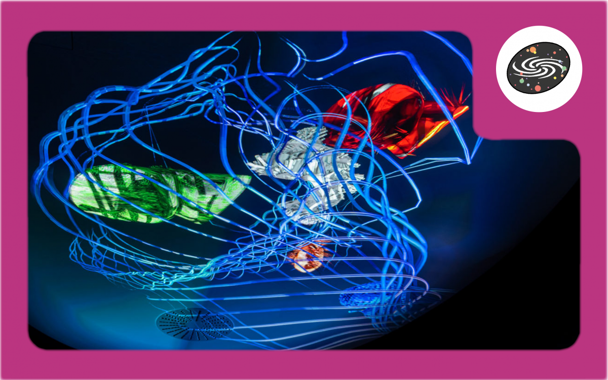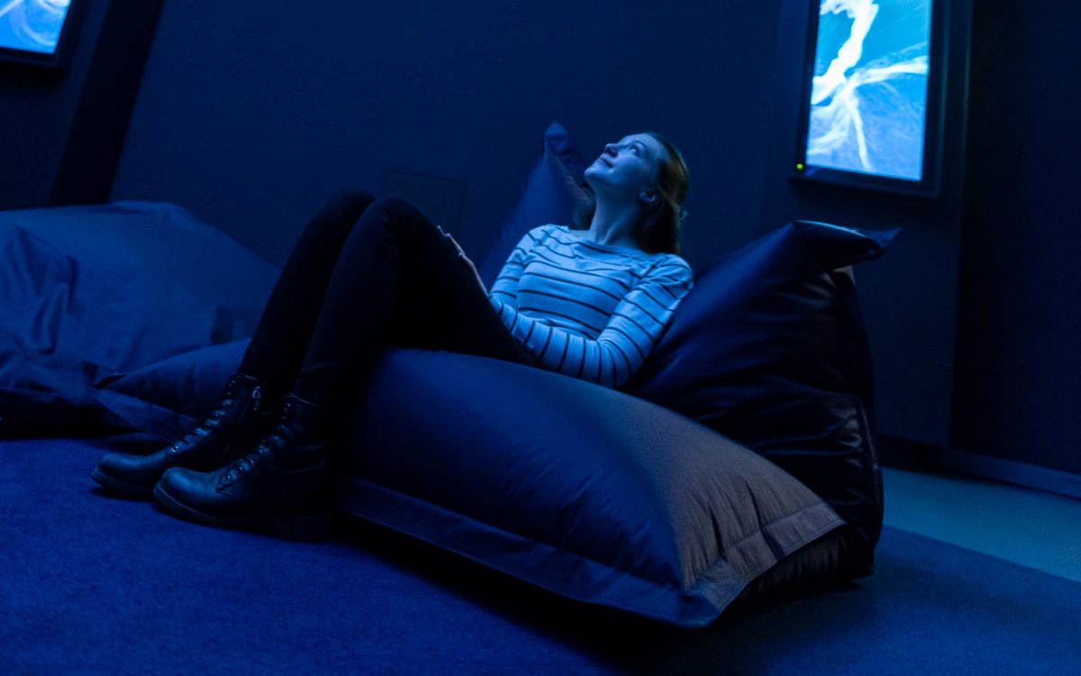 Mach es dir auf einem Sitzsack bequem und schau dir die Klangwesen – die „Clongs“ – an der Decke an!