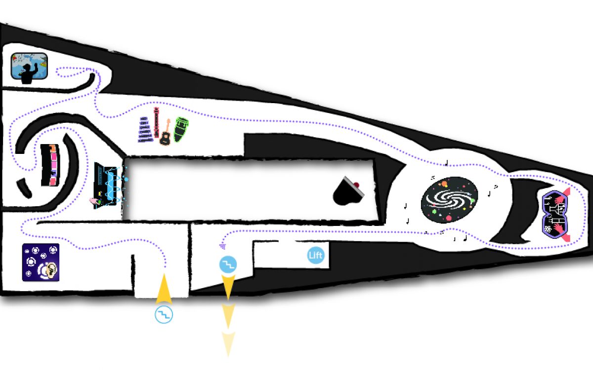Our “Origin room”: Discover different sounds. Just stand on one of the ten white circles!