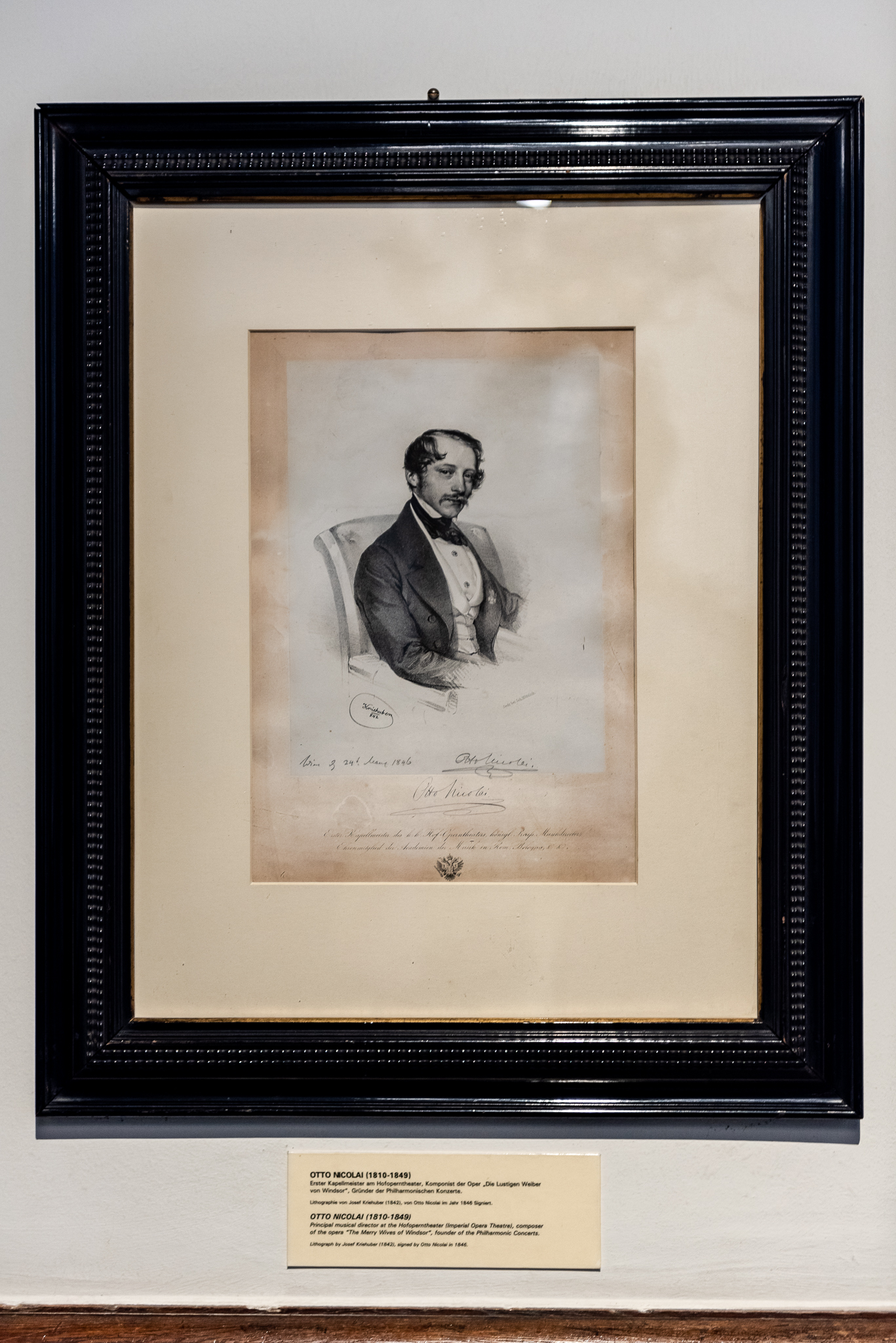 Le compositeur de renom Otto Nicolai (1810-1849) est l’auteur d’une production abondante, dont l’œuvre la plus connue « Les joyeuses Commères de Windsor » (opéra fantastico-comique) reste très interprétée de nos jours. Il est considéré comme le fondateur de l’Orchestre philharmonique de Vienne. Dès 1841, il fut le premier maître de chapelle de l’Opéra de la cour de Vienne. Recommandé par des personnalités du monde musical, il a dirigé le 28 mars 1842, dans la grande salle de la Redoute, un grand concert organisé par « l’ensemble du personnel de l’orchestre du théâtre de l’opéra impérial et royal ». L’Orchestre philharmonique de Vienne venait de voir le jour. Dans la vitrine qui se situe au milieu de cette pièce, vous trouverez le décret de création et le programme de ce concert. Ce qu’on a appelé à l’origine les « concerts philharmoniques » ont été rebaptisés « concerts d’abonnement philharmonique » en 1860, et ce n’est qu’en 1908 qu’a été fondée officiellement « l’Association musicale de l’Orchestre philharmonique de Vienne ».