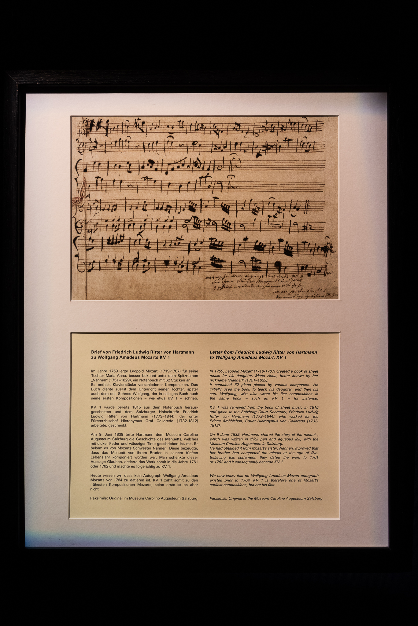 Comme l’indique le fac-similé situé sur le mur de droit, Johannes Chrysostomus Wolfgangus Theophilus Mozart commença sa carrière très précocement: c’est à tout juste 5 ans qu’il composa son premier morceau. Son dernier prénom, Theophilus, fut tout d’abord transformé en Gottlieb, puis en Amadeus. Mozart n’utilisa jamais lui-même cette forme latine, mais, à partir de 1780, il se rebaptisa Wolfgang Amadé.