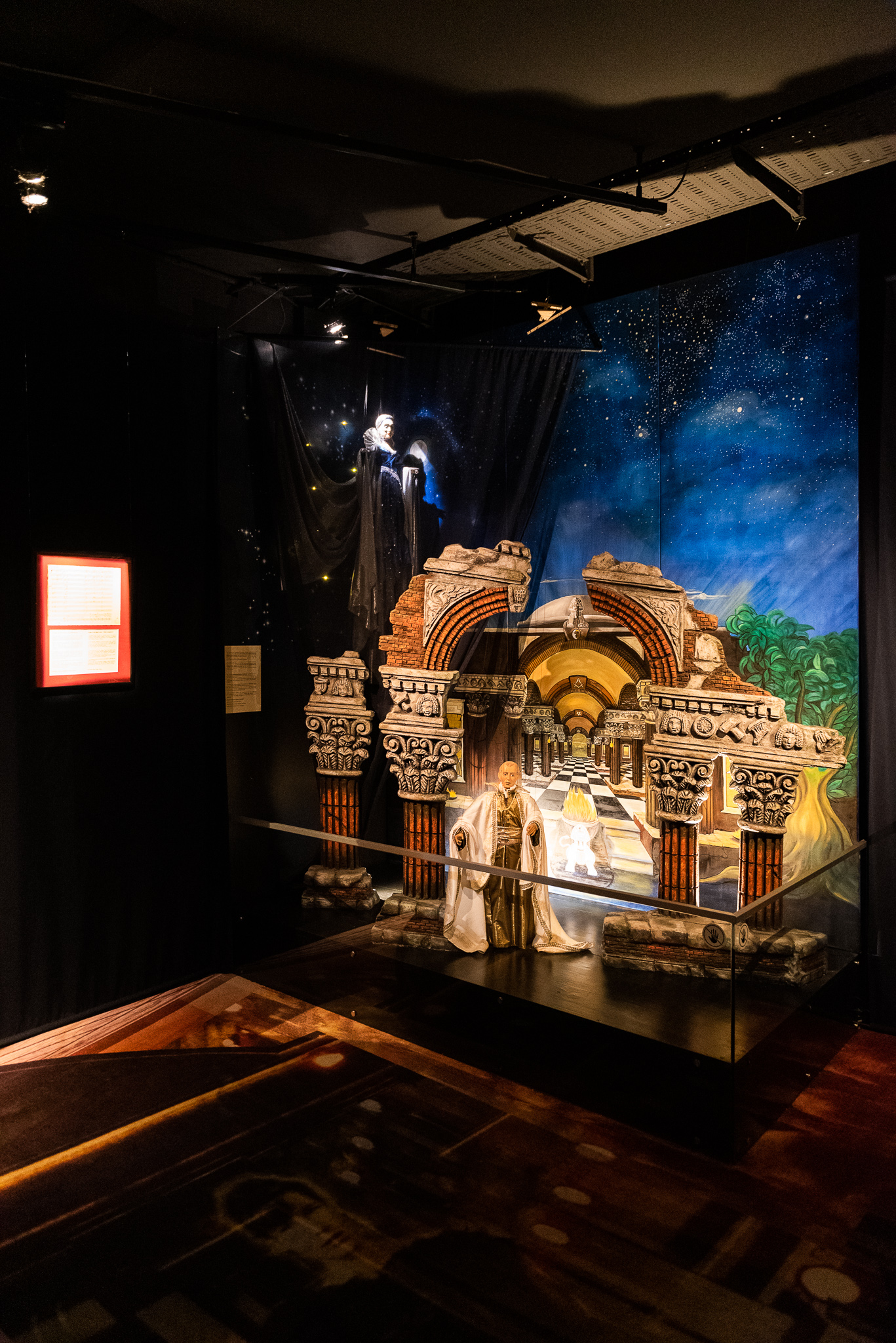 L’opéra le plus célèbre de Mozart est « La Flûte enchantée ». A votre gauche, vous voyez l’affiche du théâtre de la première représentation (1791) ainsi que deux fac-similés d’arias et les marionnettes de Sarastro, le « Roi du Soleil » avec son adversaire, la « Reine de la Nuit ». En outre, sur la colonne, vous trouvez également des tableaux de Schinkel représentant la scénographie de 1816, et, à côté, un modèle de la nouvelle mise en scène à l’Opéra d’État  le 1er juin 2000. Ces objets provenant de trois siècles différents mettent en lumière l’influence, sur l’art, des ressentis et de l’air du temps. On ne peut omettre la franc-maçonnerie quand on parle de la Flûte enchantée : non seulement Mozart, mais aussi Emanuel Schikaneder, qui a écrit le livret, étaient des Frères de Loges. Cet opéra est ponctué de références maçonniques, comme l’indique le chœur final : « Es siegte die Stärke, und krönet zum Lohn die Schönheit und Weisheit mit ewiger Kron » (La Force a triomphé et couronné la Beauté et la Sagesse pour l’éternité) qui nomme les idéaux ultimes des francs-maçons.